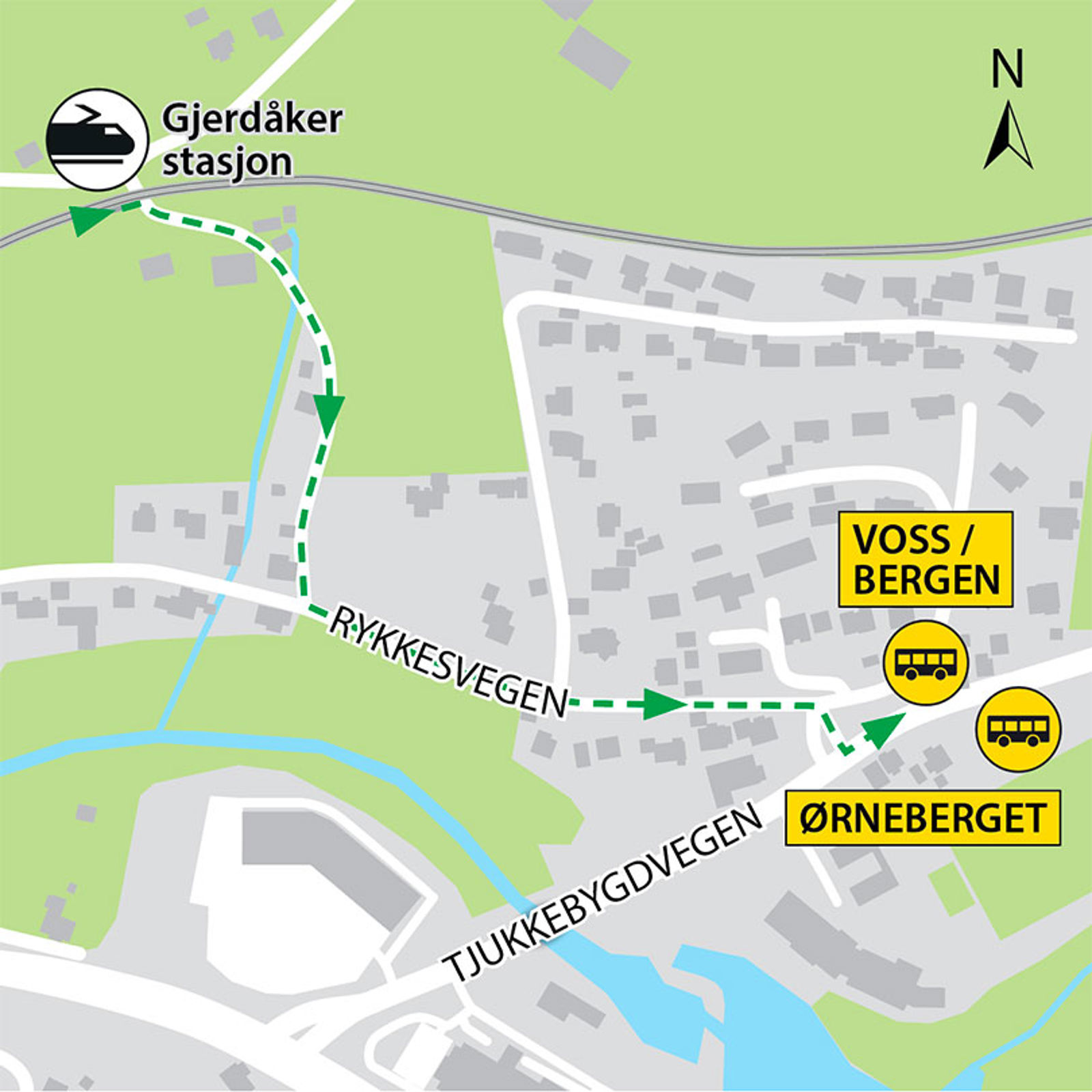 Bussene kjører fra bussholdeplassene Palmafossen skule i Tjukkebygdvegen. Gangavstand til holdeplassene er ca. 600 meter.