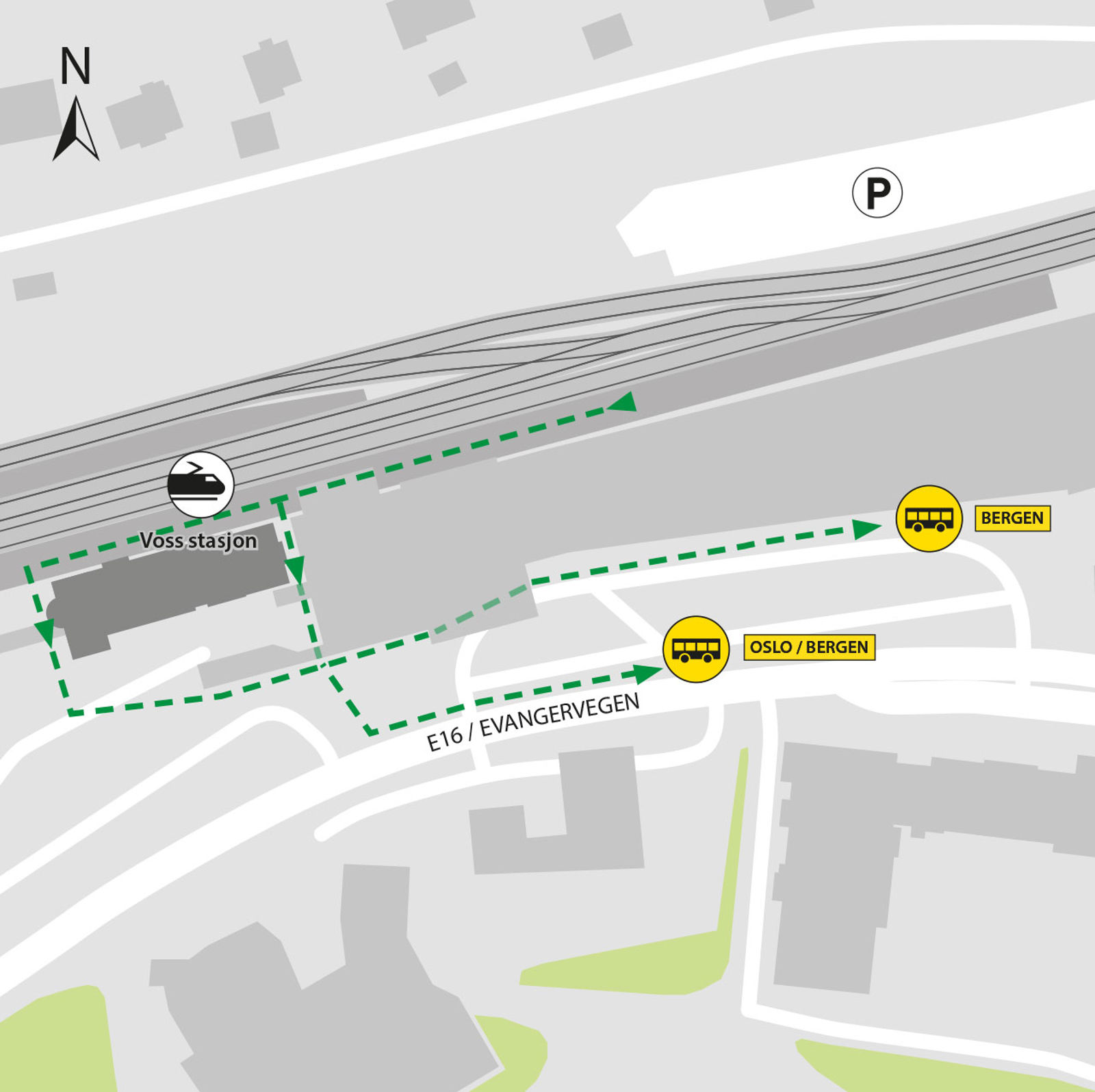 Voss stasjon ligger på Bergensbanen. Herfra kan du ta tog mot Bergen, Flåm og Oslo S.